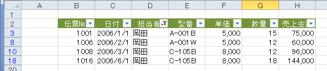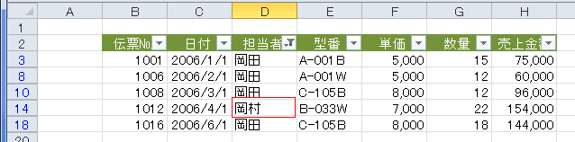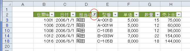 - 『担当者』が『岡田』のデータが抽出した状態です。