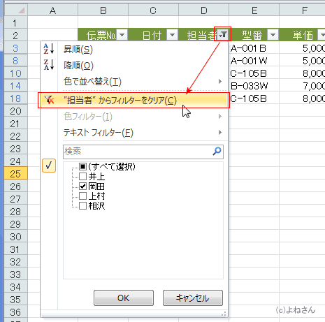 - [フィルター ボタン]をクリックして、「"担当者"からフィルターをクリア」を実行します。