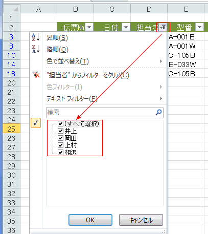 - [フィルター ボタン]をクリックして、「(すべて選択)」をクリックして、すべての名前にチェックを入れます。