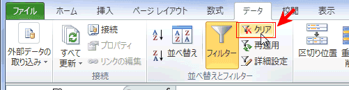 - [データ]タブの[並べ替えとフィルター]グループにある[クリア]をクリックしてフィルターを全てクリアします。
