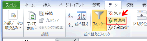 - [データ]タブの[並べ替えとフィルター]グループにある[再適用]を実行します。