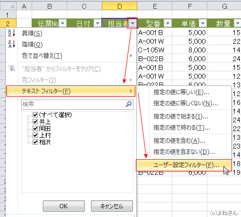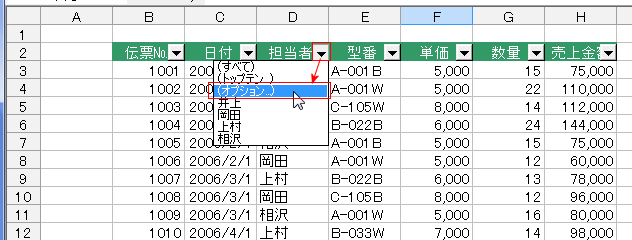 - [担当者]の[ドロップダウン矢印]をクリックすると「抽出メニュー」が表示されます