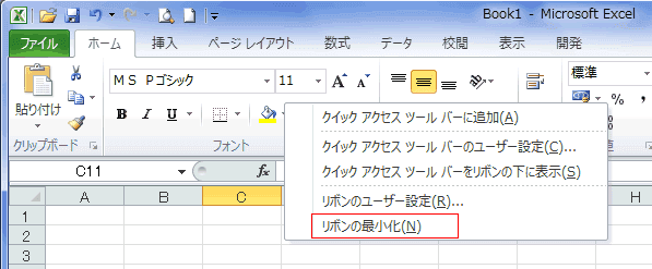 - リボンの部分やイックアクセスツールバーを右クリックして「リボンの最小化」を実行して切り替えることができます。