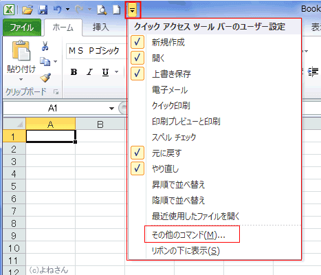 - メニューの[その他のコマンド]を実行すると、クイックアクセスツールバーのカスタマイズができます。