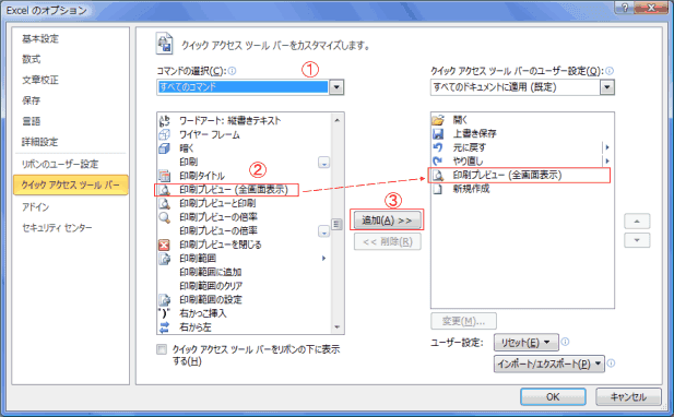 クイックアクセス ツールバーを右クリックし、[クイックアクセス ツールバーのカスタマイズ]を実行しても同じです。
