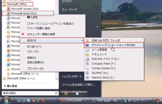 - [Microsoft Excel 2010]を右クリックし、[送る]→[デスクトップ(ショートカットを作成)]を実行します。