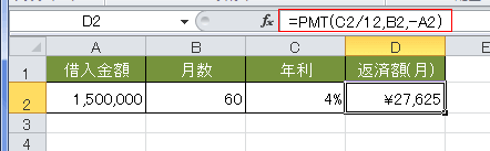 月々の返済額は=PMT(C2/12,B2,-A2) で求めて、27,625円となりました。