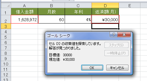 - 返済額が30,000のときの借入金額が逆算で 1,628,972 と求められました。