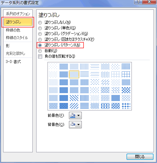 データ系列の書式設定ダイアログで「塗りつぶし」を選択し、右ペインで「塗りつぶし(パターン)」を選択すると、パターンが表示されます。