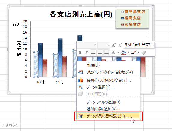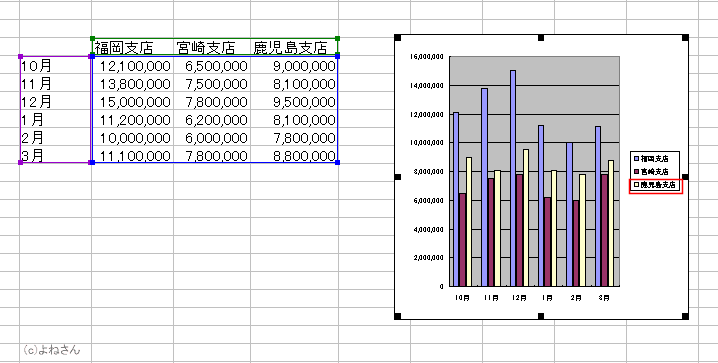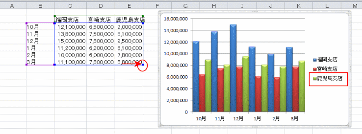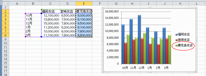 下図では系列「鹿児島支店」のデータを選択しています。