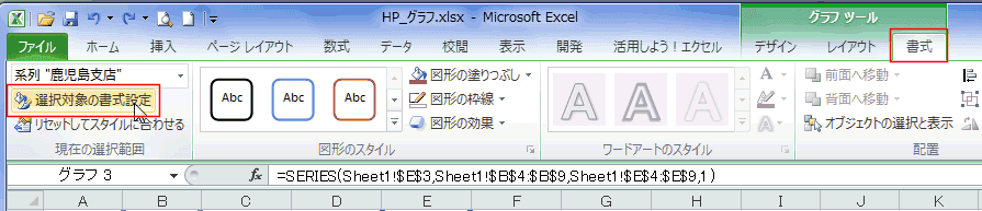 リボンからはグラフツールの[書式]タブで、現在の選択範囲グループの[選択対象の書式設定]を実行します。