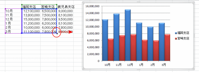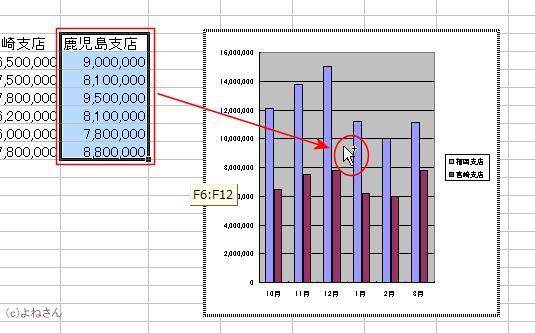 データ系列「鹿児島支店」のセル範囲を選択して、グラフへドラッグアンドドロップします。