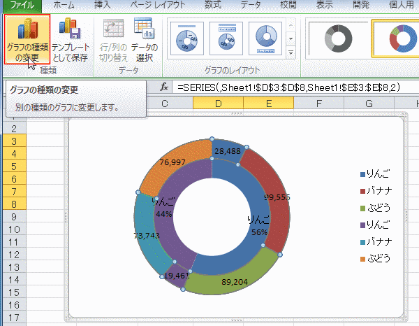 - 中央の円グラフにしたい方を選択します。ここではりんご〜ぶどうのグラフを選択します。