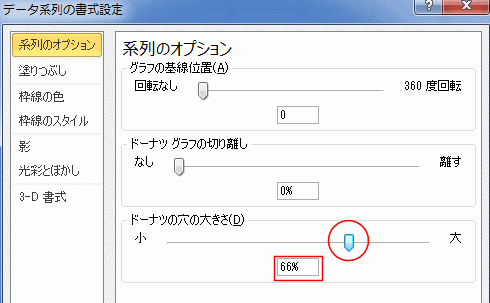 - 外側の系列をダブルクリックして、書式設定ダイアログを表示します。