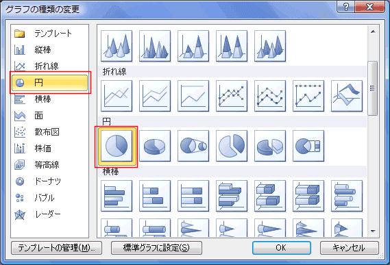 - 「グラフの挿入」ダイアログが表示されますので、[円]の[円]を選択し[OK]ボタンをクリックします。