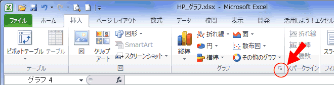 - [挿入]タブのグラフグループにある「ダイアログボックスアクセスランチャー」をクリックします。