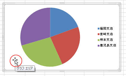 - 円グラフのプロットエリアは円に接する四角の領域ですので、四隅の円グラフの無い部分をクリックします。