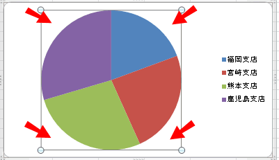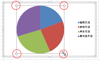 - 円グラフのサイズを変更したいときはプロットエリアを選択し、四隅に表示されるハンドルをドラッグして拡大/縮小ができます。
