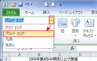 または、「グラフツール」リボンの「レイアウト」タブで[グラフの要素]から[プロットエリア]を選択します。