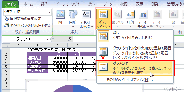 - グラフツール リボンの[レイアウト]タブの[グラフタイトル]→[グラフの上]を実行しました。