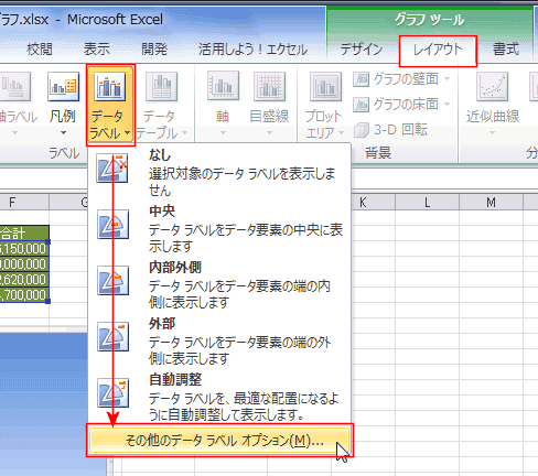 - [レイアウト]タブの[データラベル]→[その他のデータラベル オプション]を選択します。