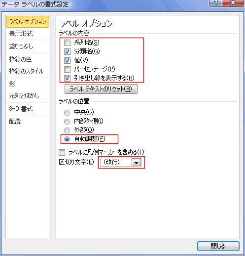 - 「データラベルの書式設定」ダイアログが表示されますので、下図のように変更しました。