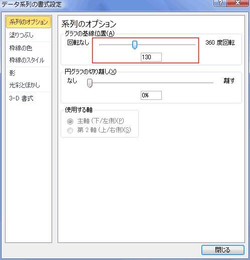 - データ系列の書式設定 ダイアログで「グラフの基線位置」を変更します。下図では「130」としました。