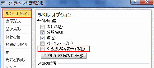 - ラベルオプションを選択し、「引き出し線を表示する」のチェックを外します。