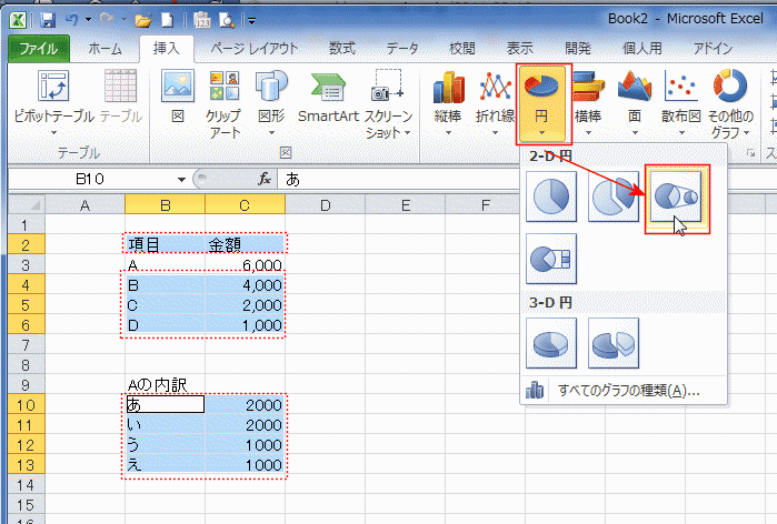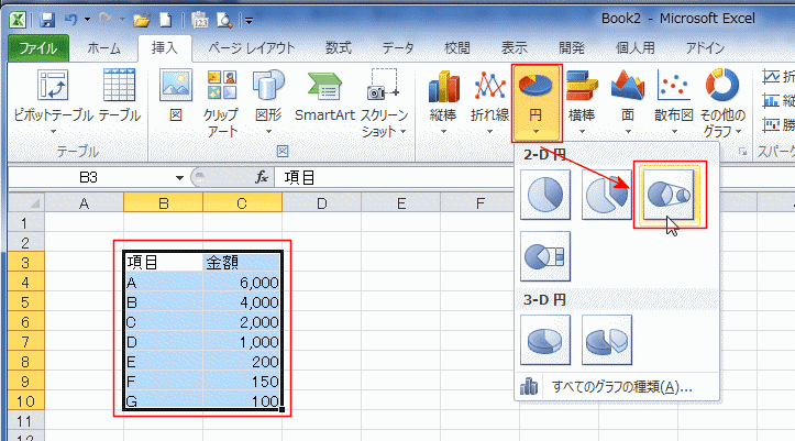 [挿入]タブの[円]→[補助円付き円グラフ]を選択します。
