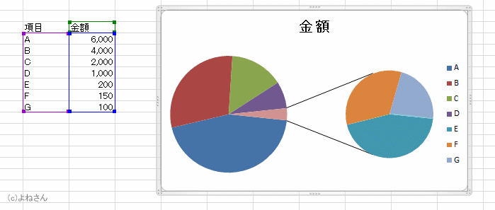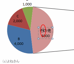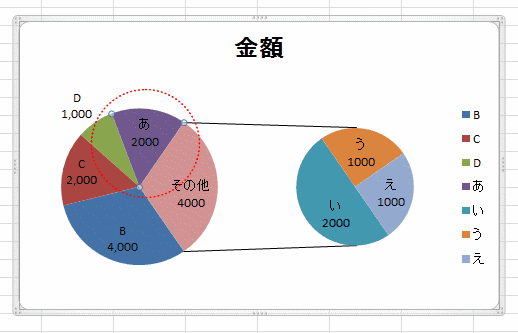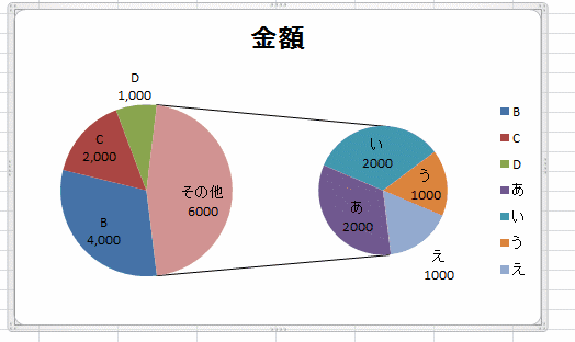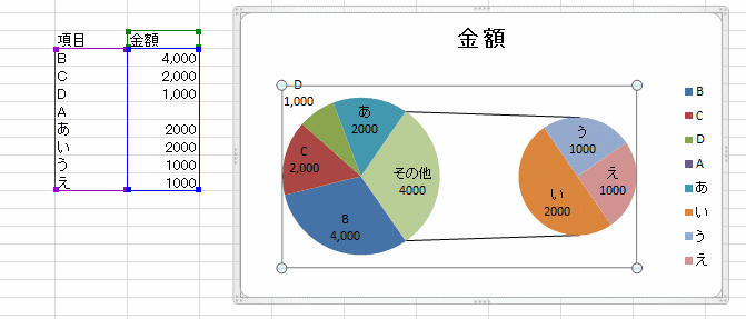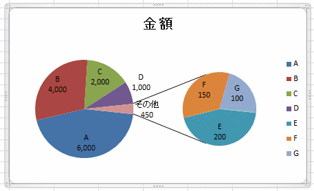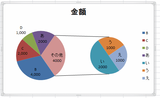 - 主になる円グラフに「その他」が作成され、データリストの下3個が補助円グラフになるという仕組みになっているためです。