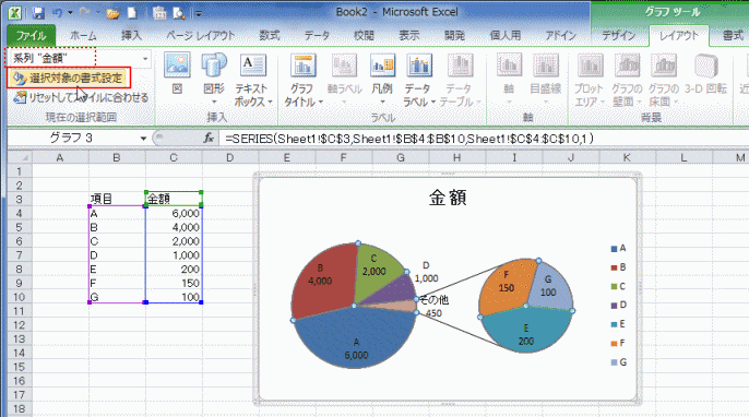 - 円グラフを選択して、[レイアウト]タブの[選択対象の書式設定]を実行します。
