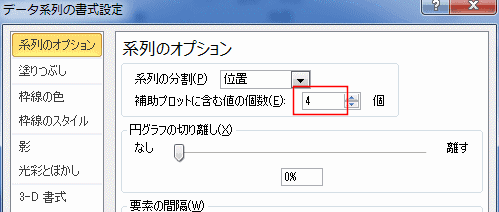 - 系列のオプションを選択し、補助プロットに含む値の個数を「4」にしました。