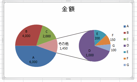 - 補助円グラフ付き円グラフは主になる円グラフに「その他」が作成され、データリストの下3個が補助円グラフになるという仕組みになっています。