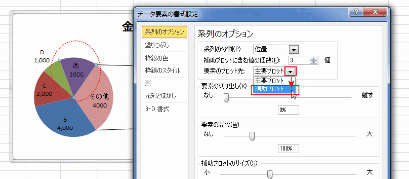 - 「主要プロット=円グラフ」と「補助プロット=補助円グラフ」の変更や、補助プロットの個数を変更することが可能ですので、あとからの変更も可能です。