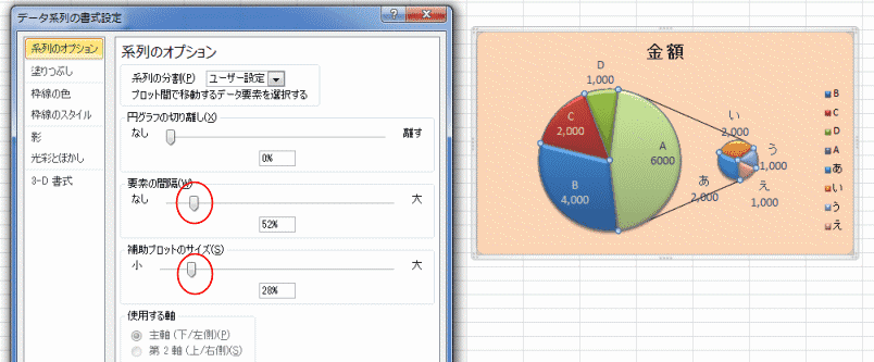 要素の間隔のスライダーをドラッグすると円グラフと補助円グラフの距離を変更できます。