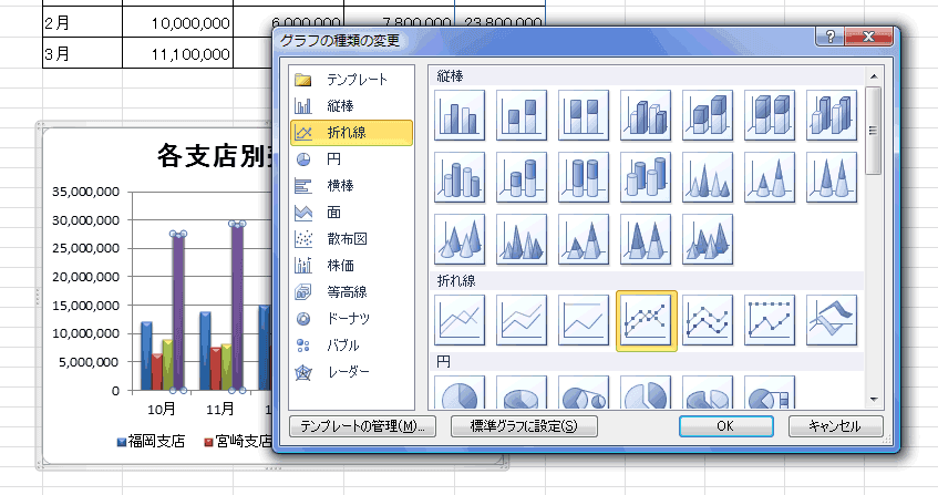 - [折れ線]を選択し、右ペインで[マーカー付き折れ線]を選択し、[OK]ボタンをクリックします。
