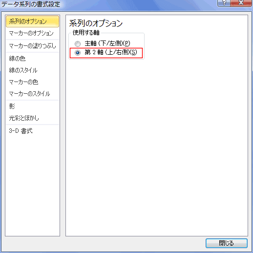 - データ系列の書式設定 ダイアログで「系列のオプション」を選択し「第2軸」を選択します。