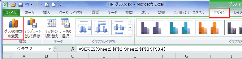- [デザイン]タブの[グラフの種類の変更]を実行します。
