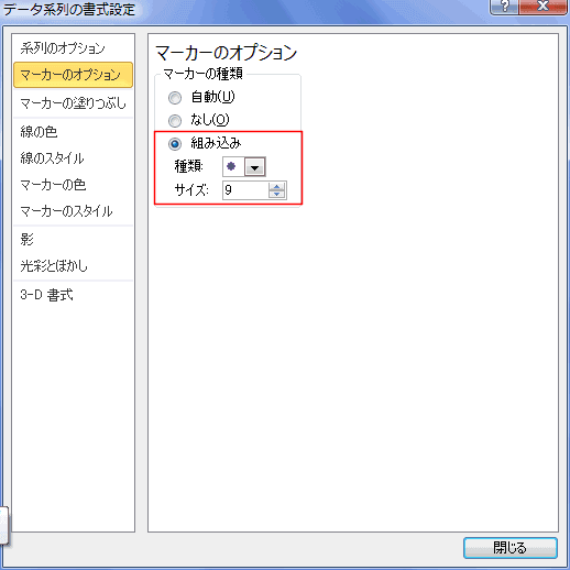 - 「マーカーのオプション」を選択し、「組み込み」を選択してサイズを「9」に変更しました。