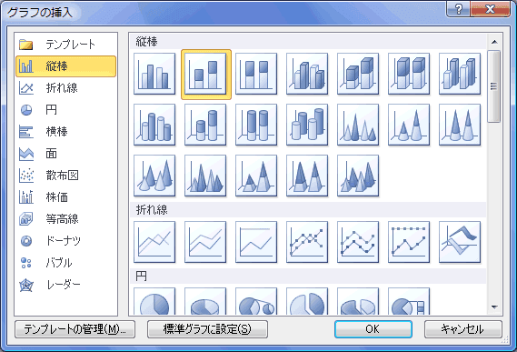 - 「グラフの挿入」ダイアログが表示されますので、[縦棒]の[積み上げ縦棒]を選択し[OK]ボタンをクリックします。