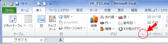 - [挿入]タブのグラフグループにある「ダイアログボックスアクセスランチャー」をクリックします。