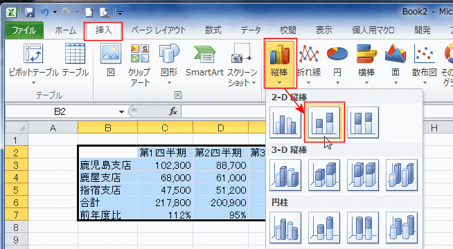 - セル範囲B2:F7を選択し、[挿入]タブのグラフグループにある[縦棒]→[2-D縦棒の積み上げ縦棒]を実行します。