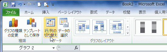 - 横軸を第1四半期〜第4四半期としたいので、グラフツール リボンの[デザイン]タブで[行/列の切り替え]を実行します。