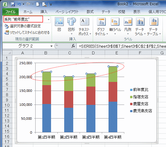 系列「前年度比」はグラフでは非常に小さいのでクリックして選択できないので、リボンから操作します。