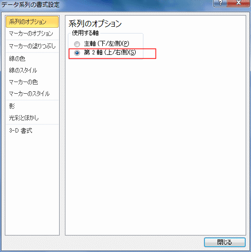 - 系列のオプションで「第2軸」にチェックを入れて[閉じる]ボタンをクリックします。
