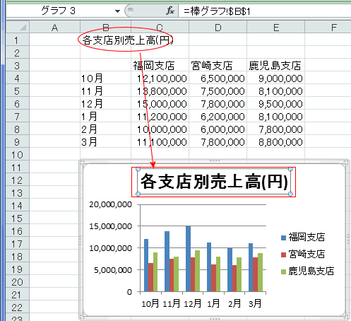 - Enterキーを押すとB1セルの値がグラフタイトルに表示されました。