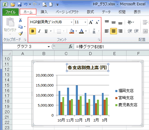 - グラフタイトルのフォントやサイズは[ホーム]タブから実行できます。