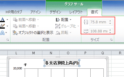 - グラフタイトルを選択して、グラフツール リボンの[書式]タブにあるサイズを見ると、グレー表示で操作できません。