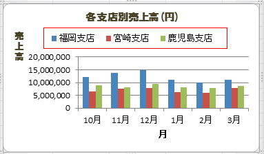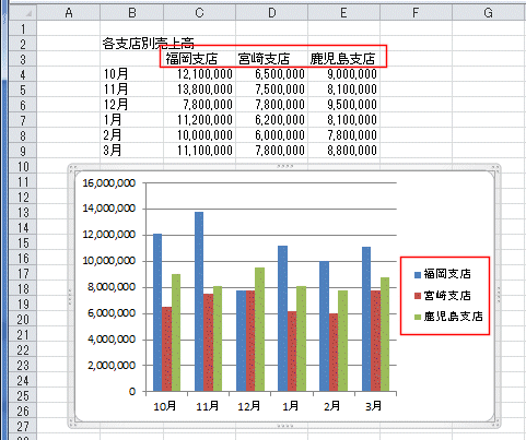 - 下図の例ではグラフの凡例にシートのC3:E3セルの値が使用されています。
