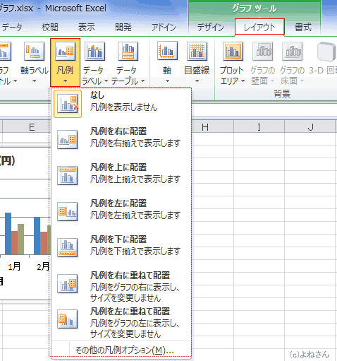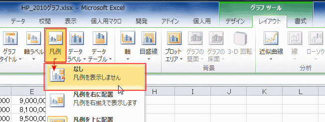 - グラフツール リボンのレイアウトタブの[ラベル]グループにある[凡例]をクリックします。